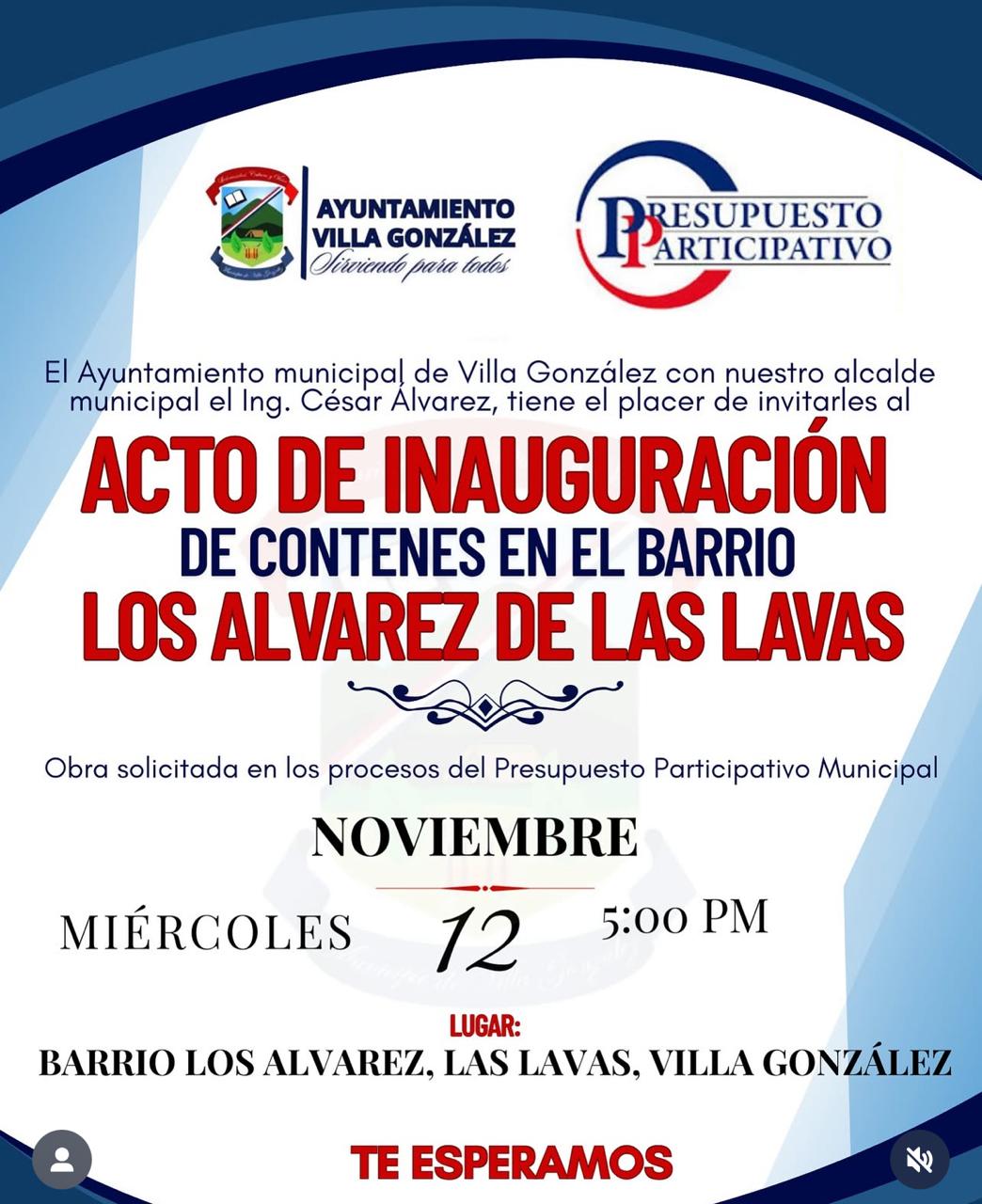El Ayuntamiento municipal de Villa González con nuestro alcalde municipal el Ing. César Álvarez, tiene el placer de invitarles al “Acto de Inauguración de contenes en el Barrio Los Álvarez de Las Lavas, Villa González”.