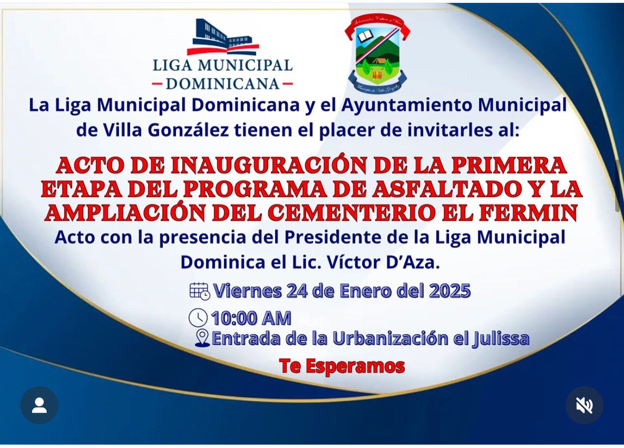 La Liga Municipal Dominicana y el Ayuntamiento Municipal de Villa González tienen el placer de invitarles al Acto de Inauguración de la Primera Etapa del Programa de Asfaltado y la Ampliación del Cementerio el Fermín.