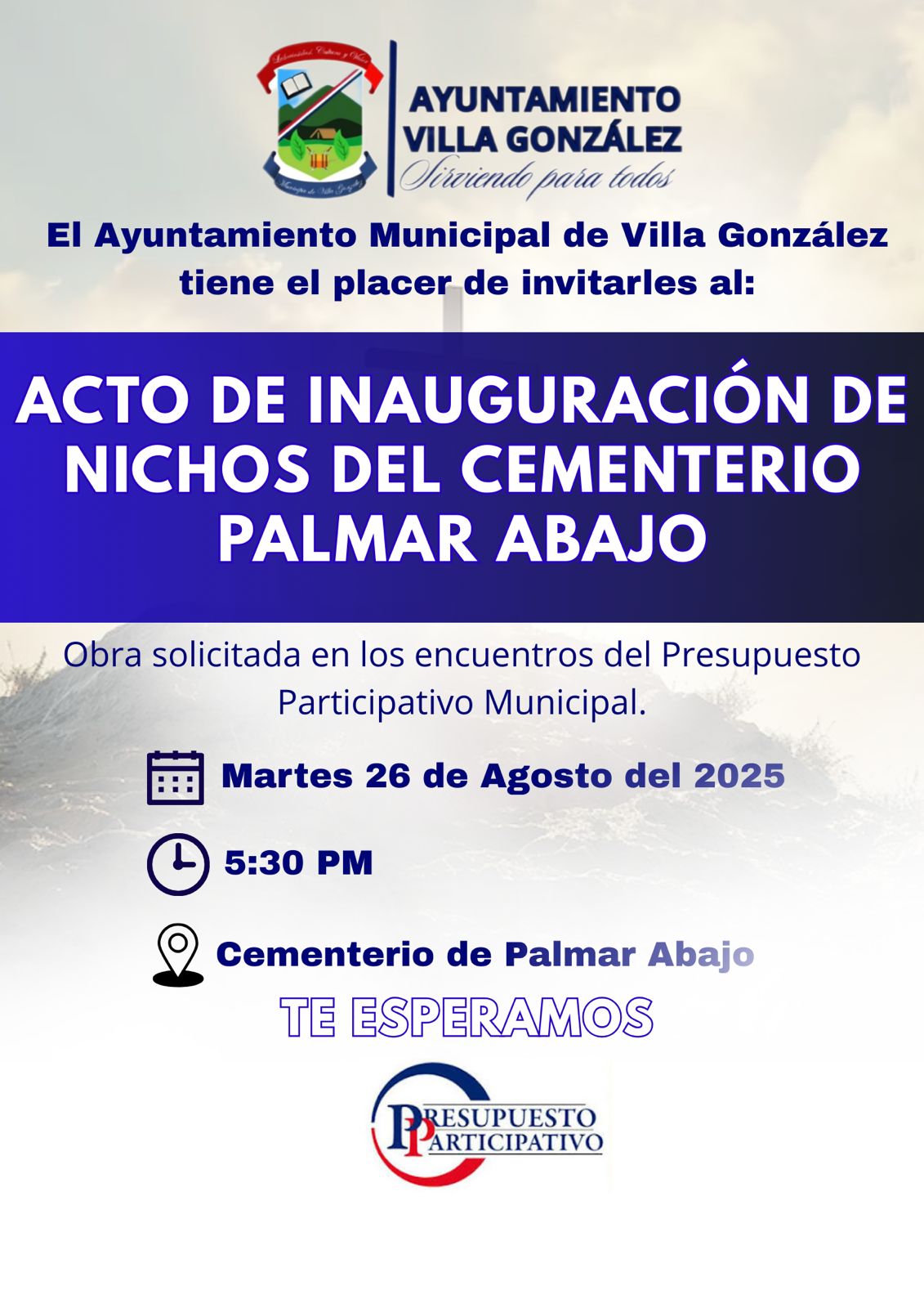 El Ayuntamiento municipal de Villa González tiene el placer de invitarles al “Acto de Inauguración de Nichos del Cementerio Palmar Abajo”.