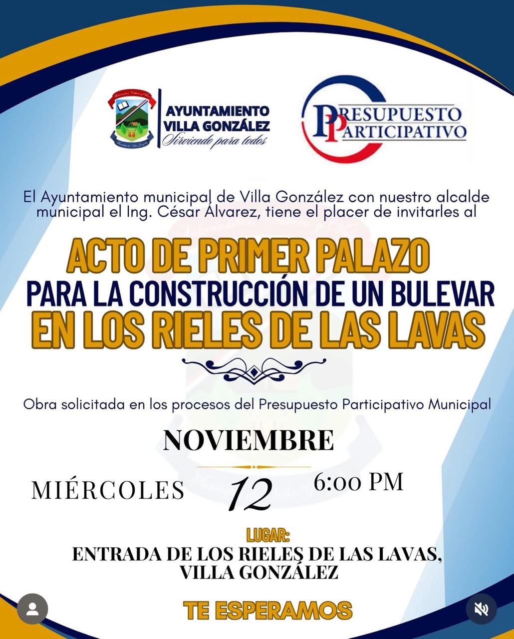 El Ayuntamiento municipal de Villa González con nuestro alcalde municipal el Ing. César Álvarez, tiene el placer de invitarles al “Acto de primer palazo para la construcción de un bulevar en los rieles de las lavas, Villa González”.