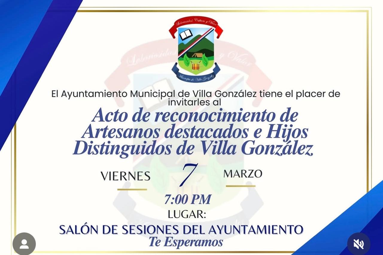 El Ayuntamiento Municipal de Villa González tiene el placer de invitarles al Acto de reconocimiento de Artesanos destacados e Hijos Distinguidos de Villa González.
