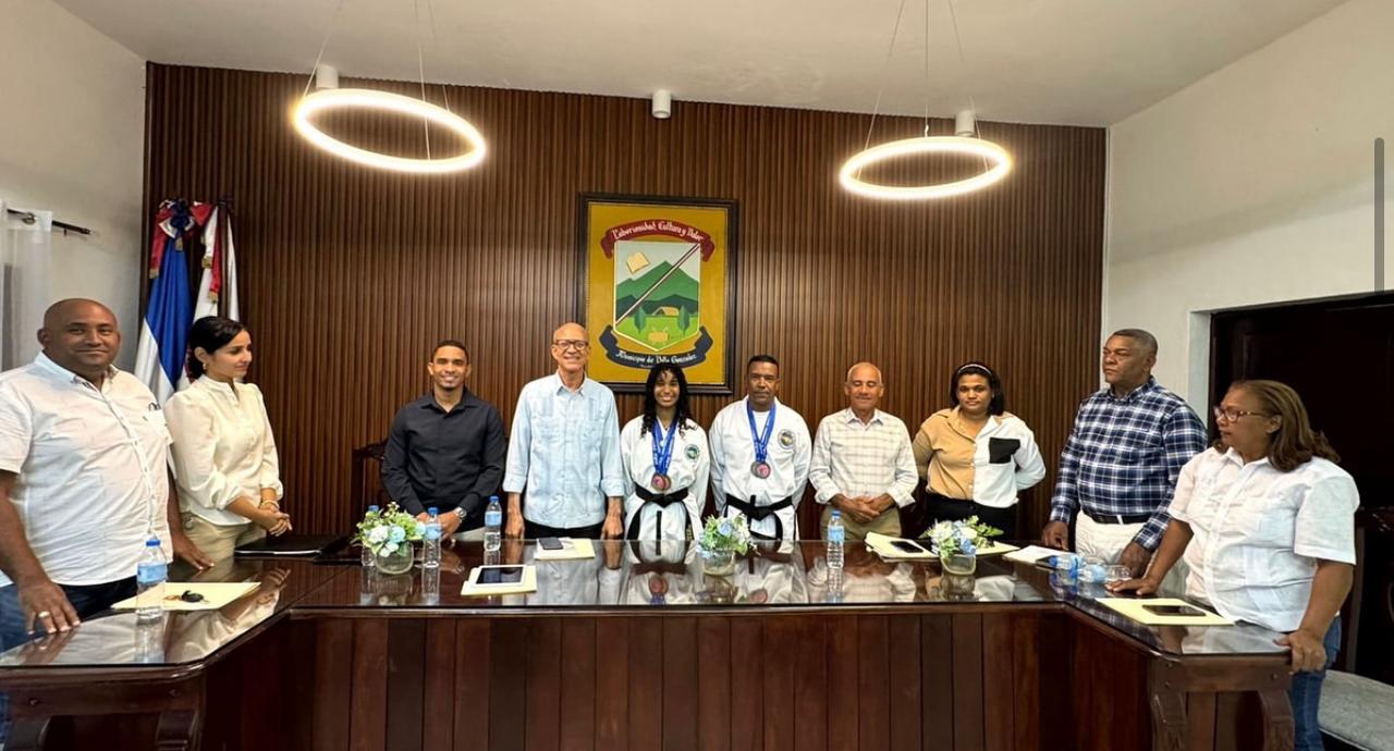 Ayuntamiento de Villa González, nuestro alcalde municipal el Ing. César Álvarez y el concejo de regidores encabezado por su presidente el señor Manuel Eduardo Torres, reciben a atletas destacados en competencia panamericana de taekwondo ITF en Colombia.