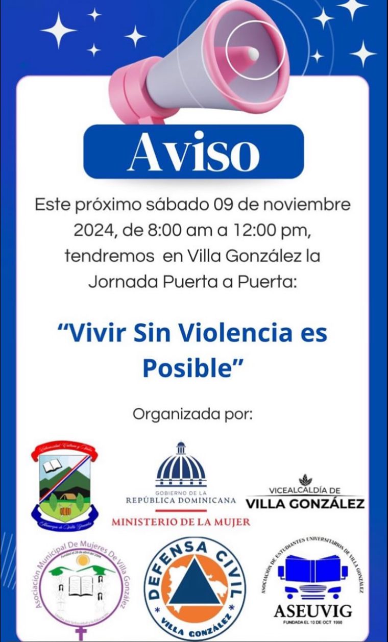 Este próximo sábado 09 de noviembre 2024 de 8:00 AM a 12:00 PM, tendremos en Villa González la jornada puerta a puerta: