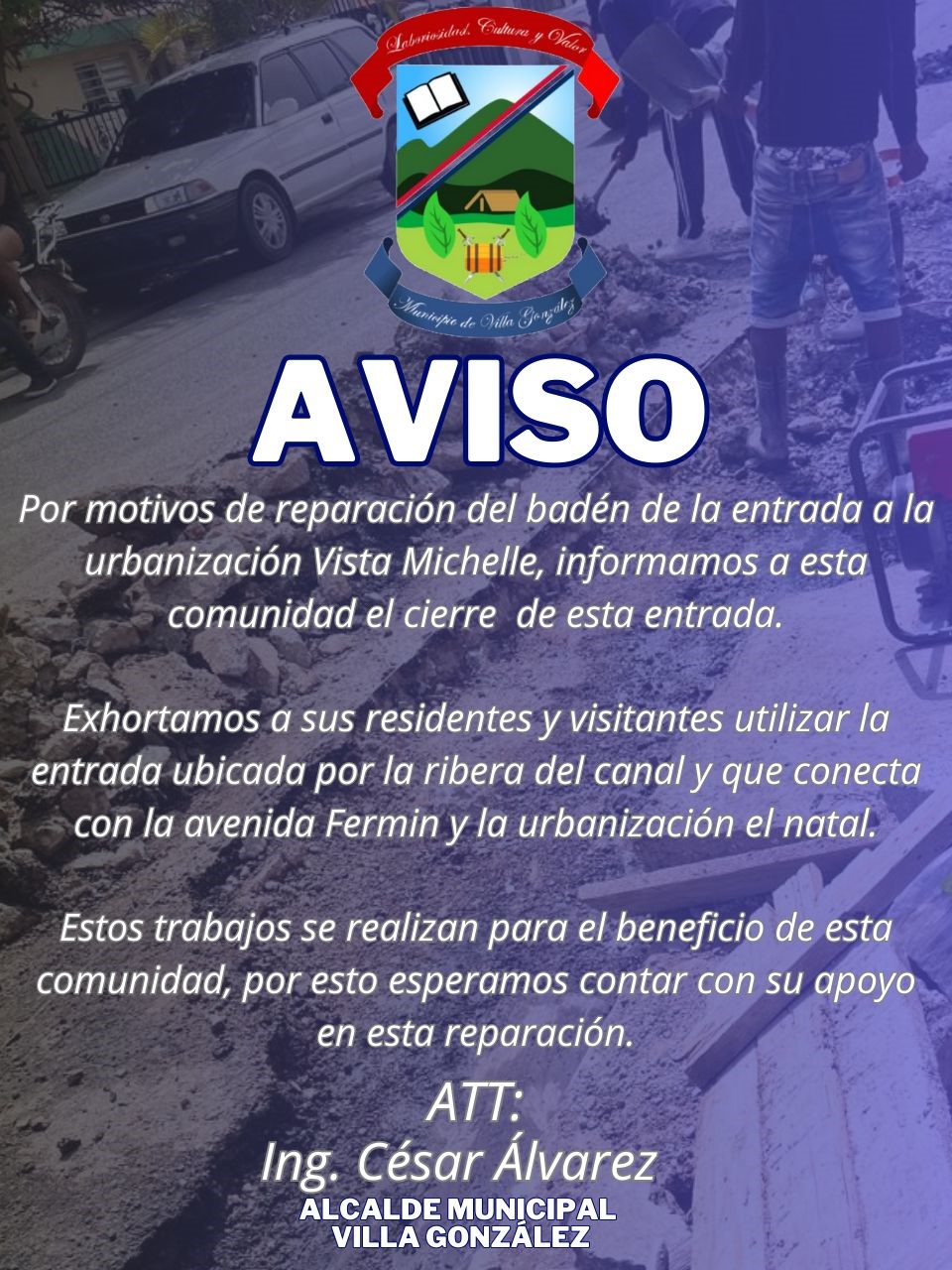 Por motivos de reparación del badén de la entrada a la urbanización Vista Michelle, informamos a esta comunidad el cierre de esta entrada.