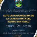 2 octubre, 2024El Ayuntamiento Municipal de Villa González tiene el placer de invitarles al Acto de Inauguración de la Cancha Mixta del...