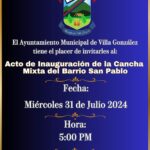 29 julio, 2024El Ayuntamiento Municipal de Villa González tiene el placer de invitarles al Acto de inauguración de la cancha mixta del...
