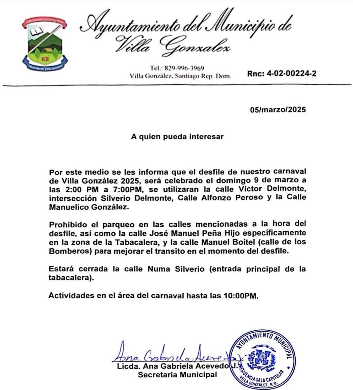 Por este medio se les informa que el desfile de nuestro carnaval de Villa González 2025, será celebrado el Domingo 9 de marzo a las 2:00 PM a 7:00 PM, se utilizarán las calles Victor Delmonte, intersección Silverio Delmonte, calle Alfonso Peroso y la calle Manuelico González.