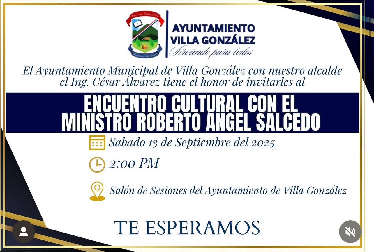 El Ayuntamiento Municipal de Villa González con nuestro alcalde el Ing. César Álvarez tiene el honor de invitarles al “Encuentro cultural con el Ministro Roberto Angel Salcedo”.