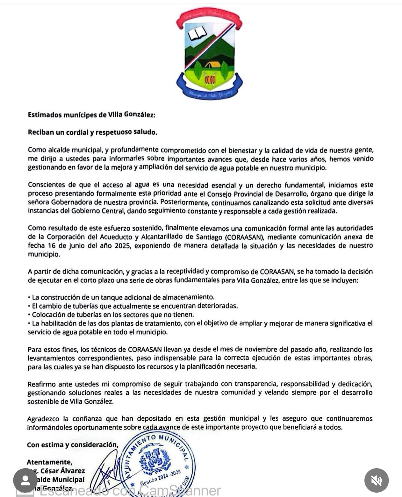 Como alcalde municipal, y profundamente comprometido con el bienestar y la calidad de vida de nuestra gente, me dirijo a ustedes para informarles sobre importantes avances que, desde hace varios años, hemos venido gestionando en favor de la mejora y ampliación del servicio de agua potable en nuestro municipio.