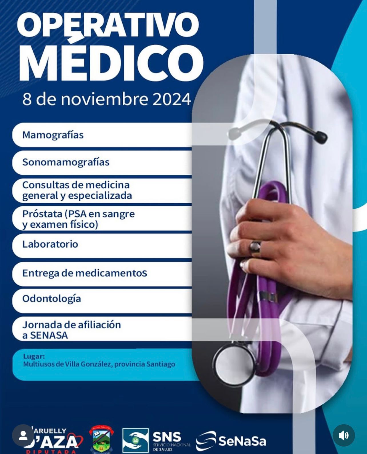 El Ayuntamiento de Villa González con nuestro alcalde el Ing. César Álvarez y la Vicepresidenta de la cámara de diputados la Dra. Dharuelly D’aza, tienen el placer de invitar a todos los municipes a un gran operativo médico gratuito.