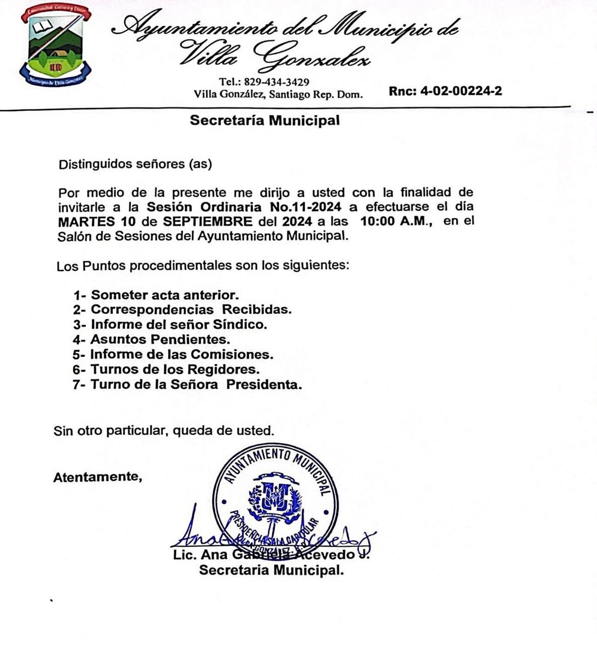 Por medio de la presente me dirijo a usted con la finalidad de invitarle a la Sesión Ordinaria No. 11-2024 a efectuarse el día martes 10 de Septiembre del 2024 a las 10:00 AM, en el Salón de Sesiones del Ayuntamiento Municipal.
