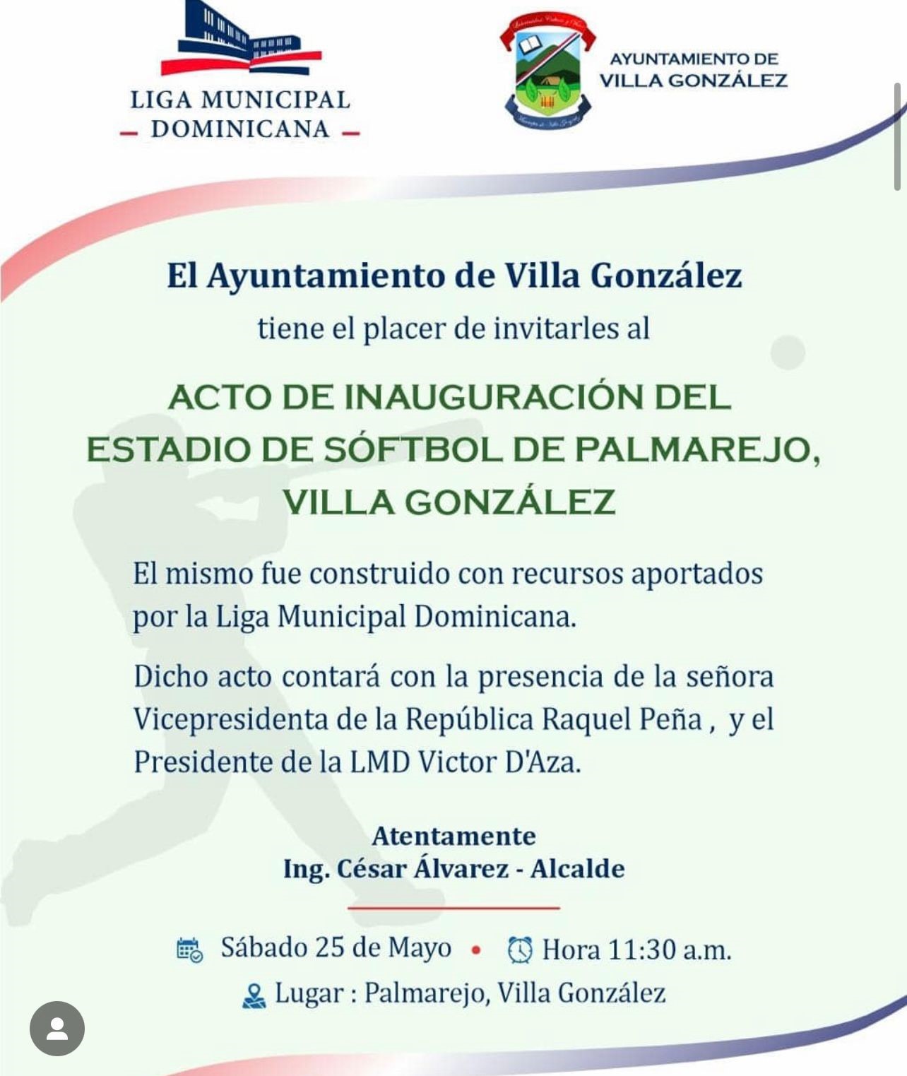 El Ayuntamiento de Villa González tiene el placer de invitarles al Acto de inauguración del Estadio de Sóftbol de Palmarejo, Villa González.