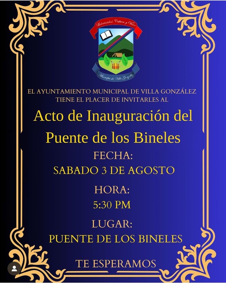 El Ayuntamiento municipal de Villa González tiene el placer de invitarles al acto de inauguración del puente de los Bineles, Palmar abajo.