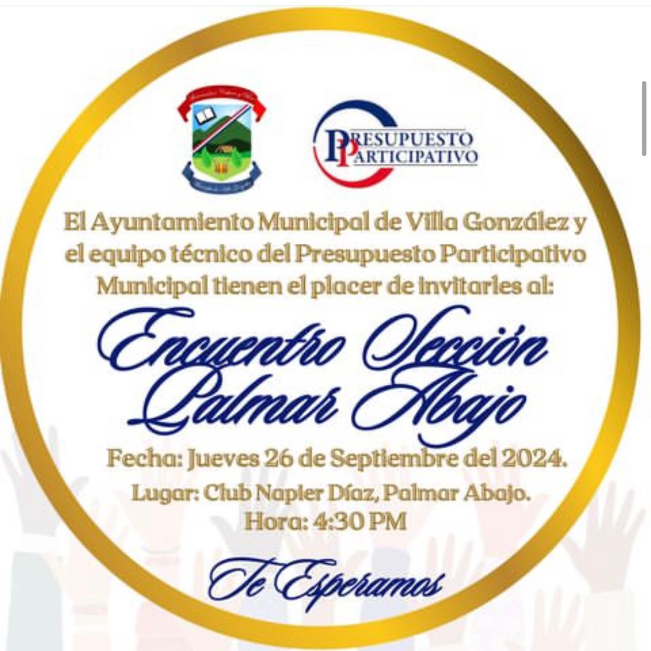 El Ayuntamiento Municipal de Villa González y el equipo técnico del Presupuesto Participativo Municipal tiene el placer de invitarles al encuentro Sección Palmar Abajo.