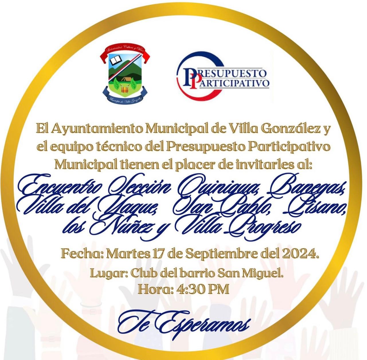 El Ayuntamiento Municipal de Villa González y el equipo técnico del Presupuesto Participativo Municipal tiene el placer de invitarles al encuentro Sección Quinigua, Banegas, Villa del Yaque, San Pablo, Pisano, Los Núñez y Villa Progreso.