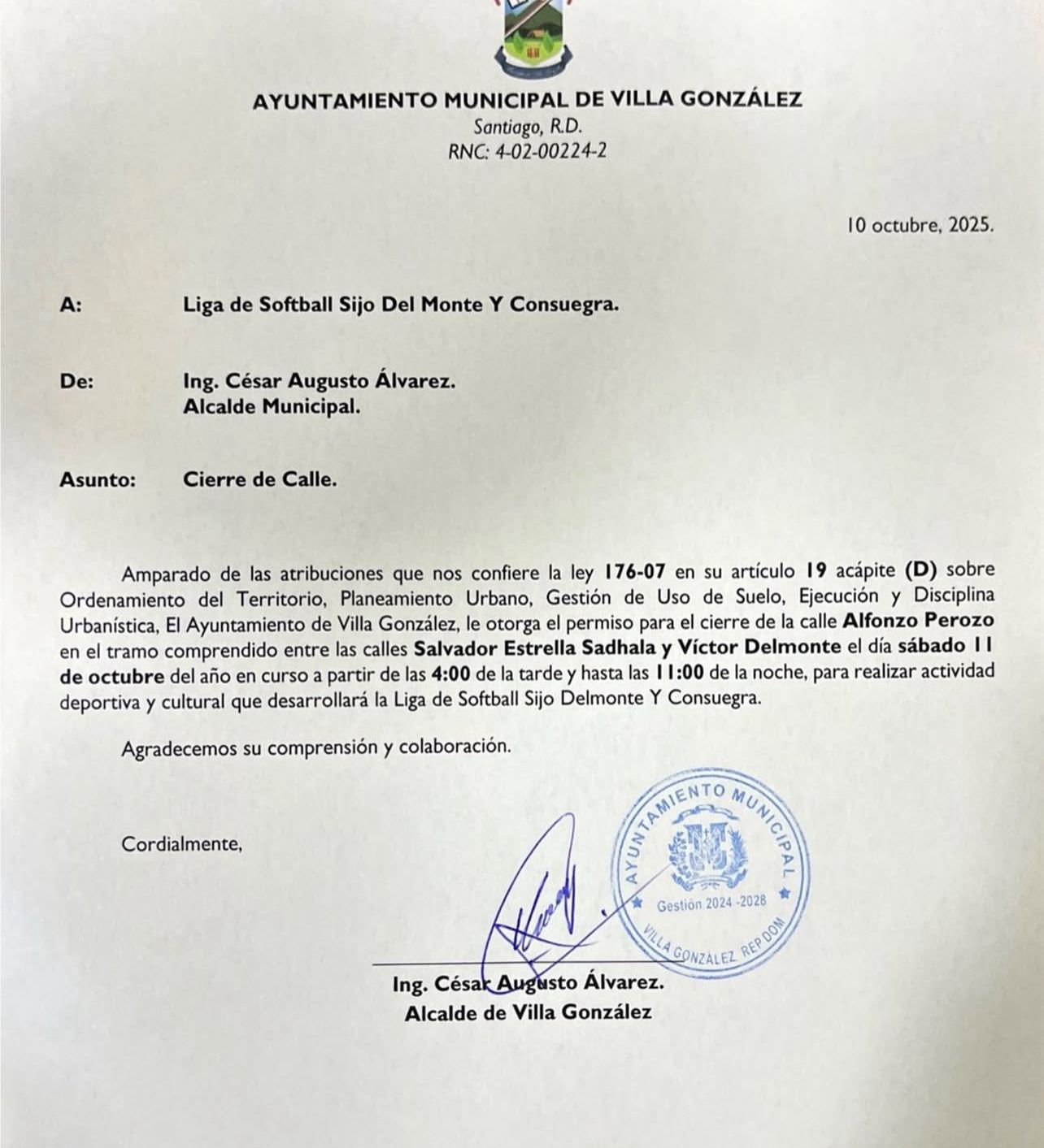Ordenamiento del Territorio, Planeamiento Urbano, Gestión de Uso de Suelo, Ejecución y Disciplina Urbanística, El Ayuntamiento de Villa González, le otorga el permiso para el cierre de la calle Alfonzo Perozo en el tramo comprendido entre las calles Salvador Estrella Sadhala y Víctor Delmonte el día sábado 11 de octubre del año en curso a partir de las 4:00 de la tarde y hasta las 11:00 de la noche, para realizar actividad deportiva y cultural que desarrollará la Liga de Softball Sijo Delmonte Y Consuegra.