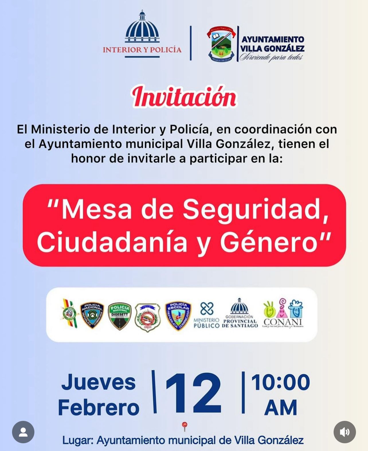 El Ministerio de Interior y Policía, en coordinación con el Ayuntamiento Municipal de Villa González tienen el honor de invitarles a la mesa de seguridad, ciudadanía y género.