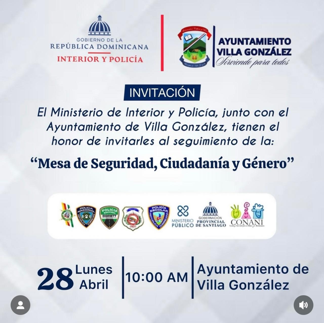 El Ministerio de Interior y Policía, junto con el Ayuntamiento Municipal de Villa González tiene el placer de invitarles a la mesa de seguridad, ciudadanía y género.