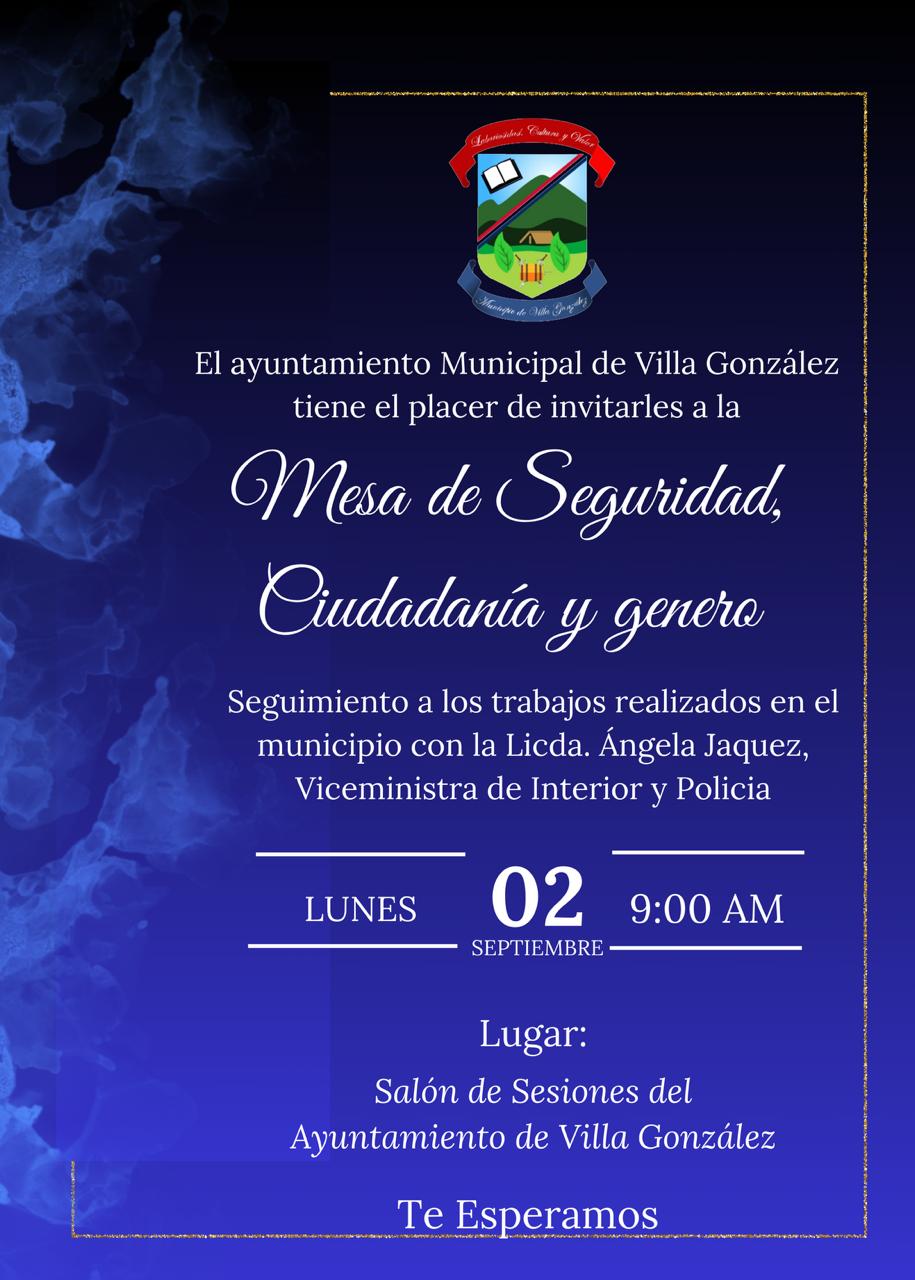 El Ayuntamiento Municipal de Villa González tiene el placer de invitarles a la mesa de seguridad, cuidadania y género.