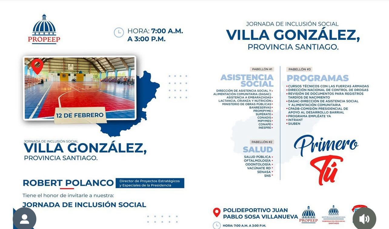 El Ayuntamiento Municipal de Villa González con nuestro alcalde el Ing. César Álvarez, el director de proyectos estratégicos y especiales de la Presidencia Robert Polanco y la Gobernación provincial de Santiago con la Licda. Rosa Santos, tienen el honor de invitarle a nuestra Jornada de inclusión social en Villa González, Santiago.