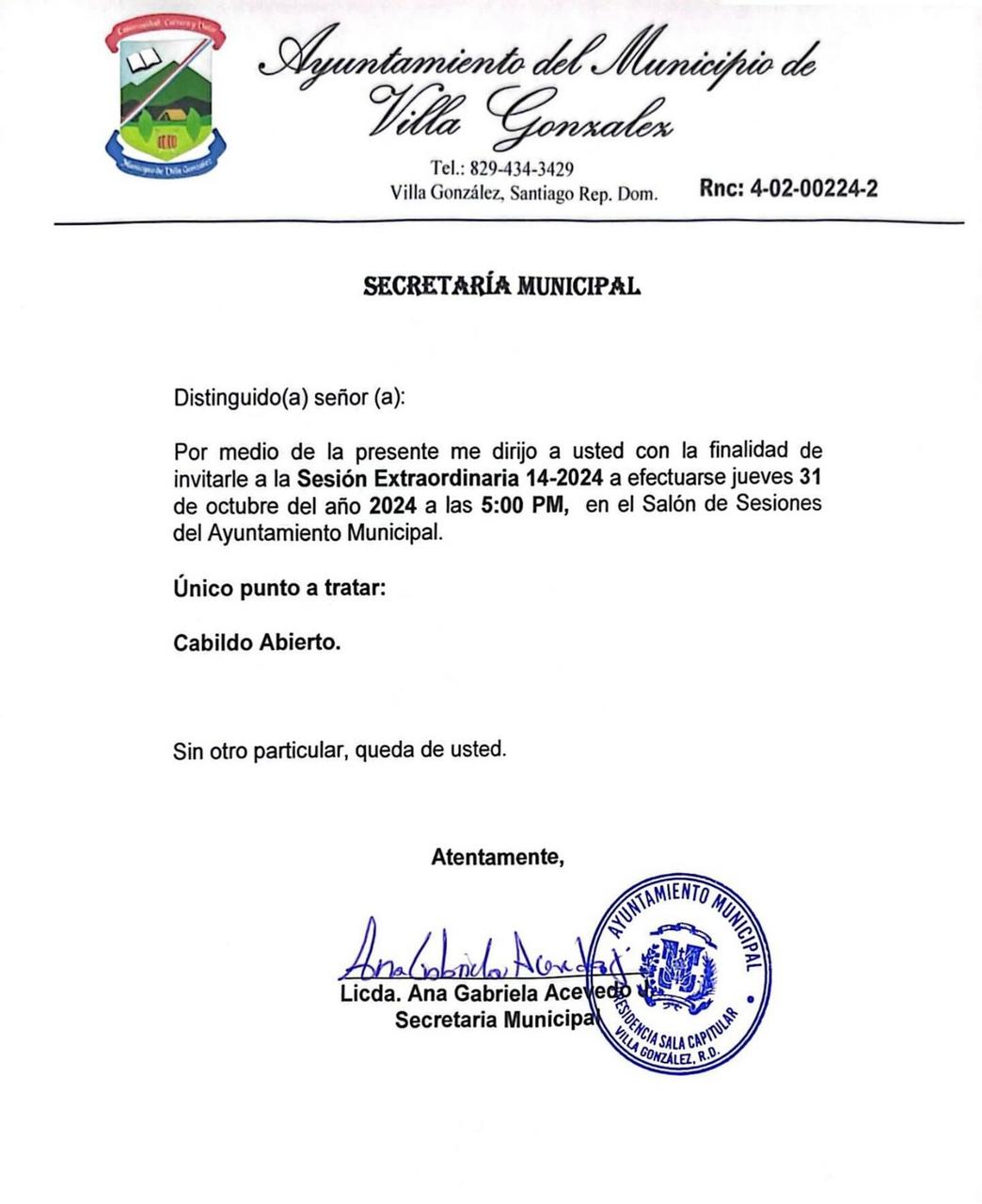 Por medio de la presente me dirijo a usted con la finalidad de invitarle a la Sesión Extraordinaria No. 14-2024 a efectuarse el día Jueves 31 de octubre del 2024 a las 5:00 PM, en el Salón de Sesiones del Ayuntamiento Municipal.