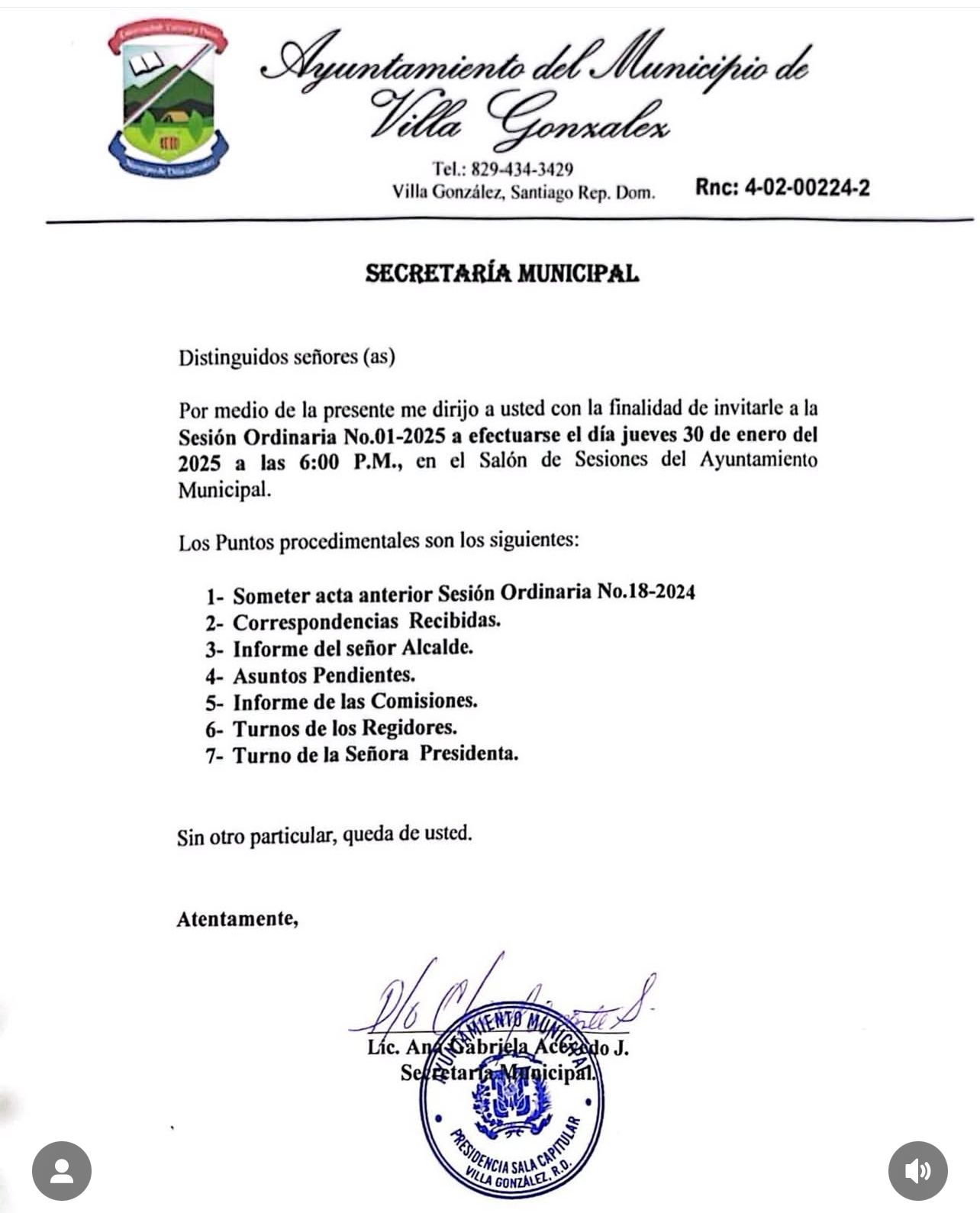 Por medio de la presente me dirijo a usted con la finalidad de invitarle a la Sesión Ordinaria No. 01-2025 a efectuarse el día Jueves 30 de enero del 2025 a las 6:00 P.M, en el Salón de Sesiones del Ayuntamiento Municipal.