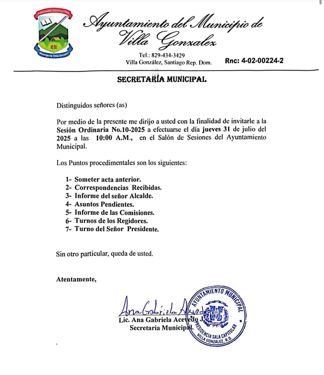Por medio de la presente me dirijo a usted con la finalidad de invitarle a la Sesión Ordinaria No. 10-2025 a efectuarse el día jueves 31 de julio del 2025 a las 10:00 AM, en el Salón de Sesiones del Ayuntamiento Municipal.