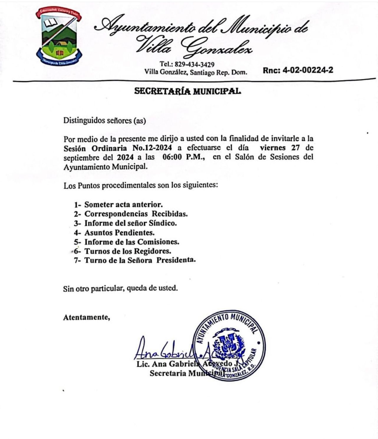 Por medio de la presente me dirijo a usted con la finalidad de invitarle a la Sesión Ordinaria No. 12-2024 a efectuarse el día viernes 27 de septiembre del 2024 a las 6:00 PM, en el Salón de Sesiones del Ayuntamiento Municipal.