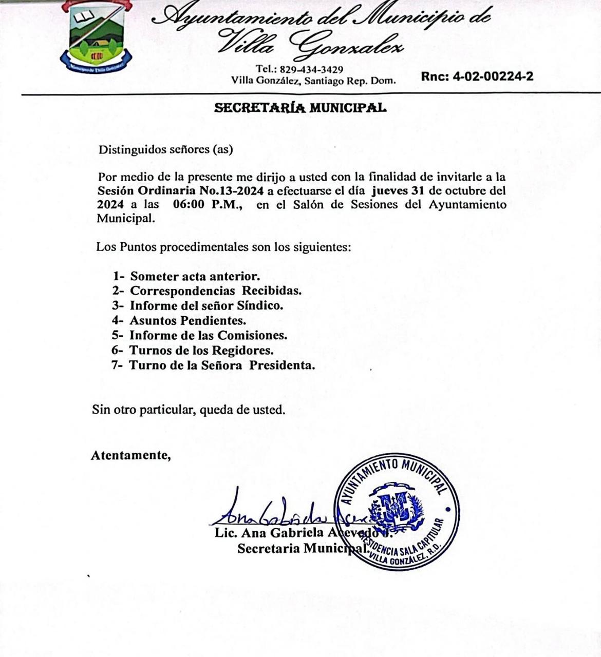 Por medio de la presente me dirijo a usted con la finalidad de invitarle a la Sesión Ordinaria No. 13-2024 a efectuarse el día Jueves 31 de octubre del 2024 a las 6:00 PM, en el Salón de Sesiones del Ayuntamiento Municipal.