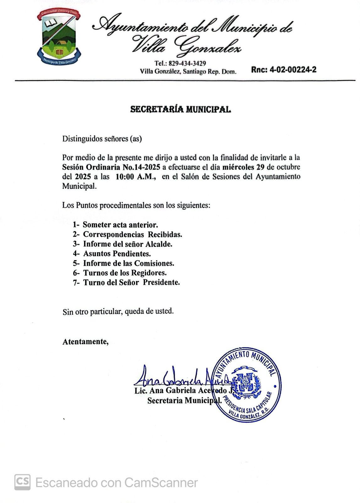 Por medio de la presente me dirijo a usted con la finalidad de invitarle a la Sesión Ordinaria No.14-2025 a efectuarse el día miércoles 29 de Octubre del 2025 a las 10:00 A.M., en el Salón de Sesiones del Ayuntamiento Municipal.