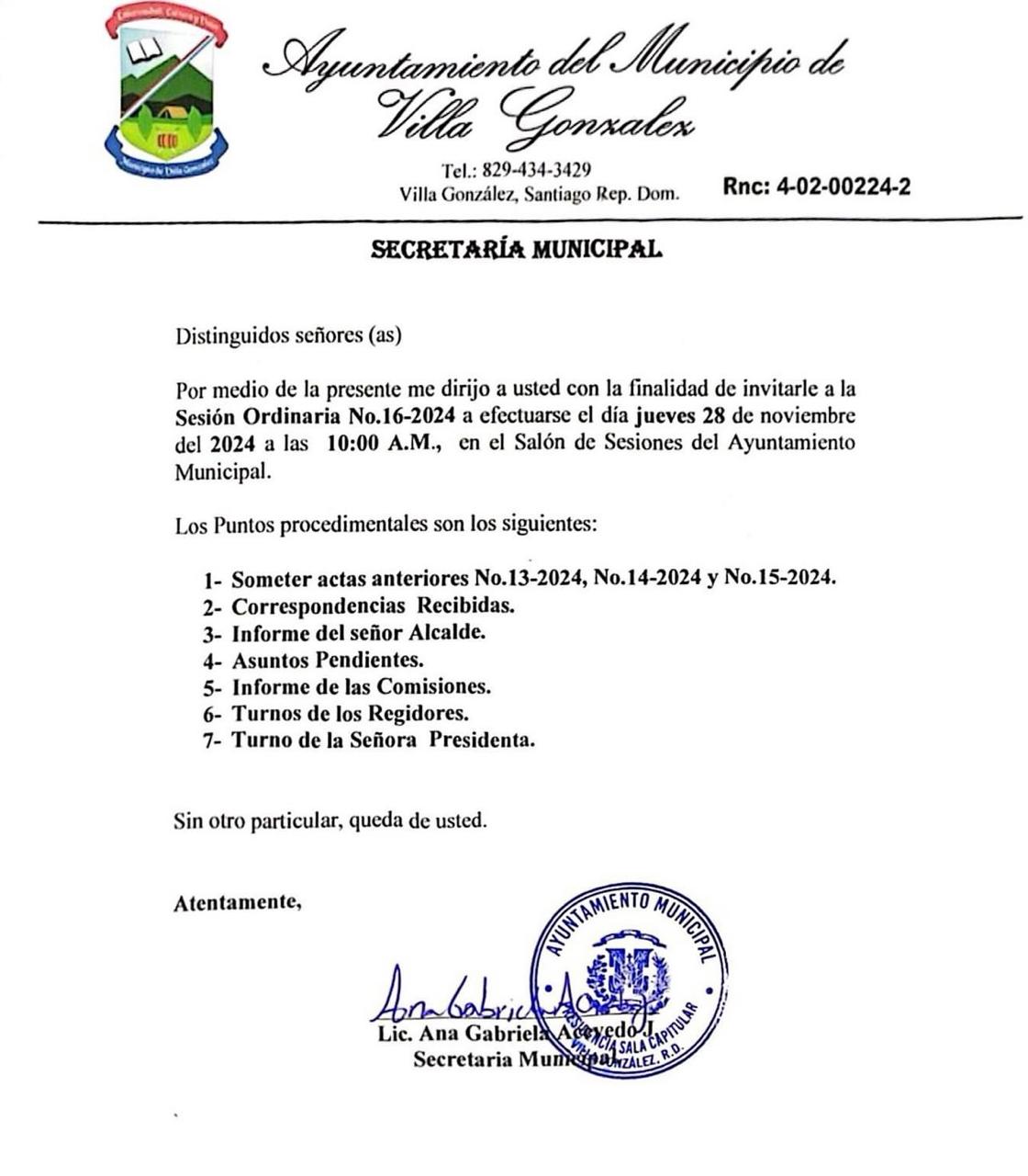 Por medio de la presente me dirijo a usted con la finalidad de invitarle a la Sesión Ordinaria No. 16-2024 a efectuarse el día Jueves 28 de noviembre del 2024 a las 10:00 AM, en el Salón de Sesiones del Ayuntamiento Municipal.