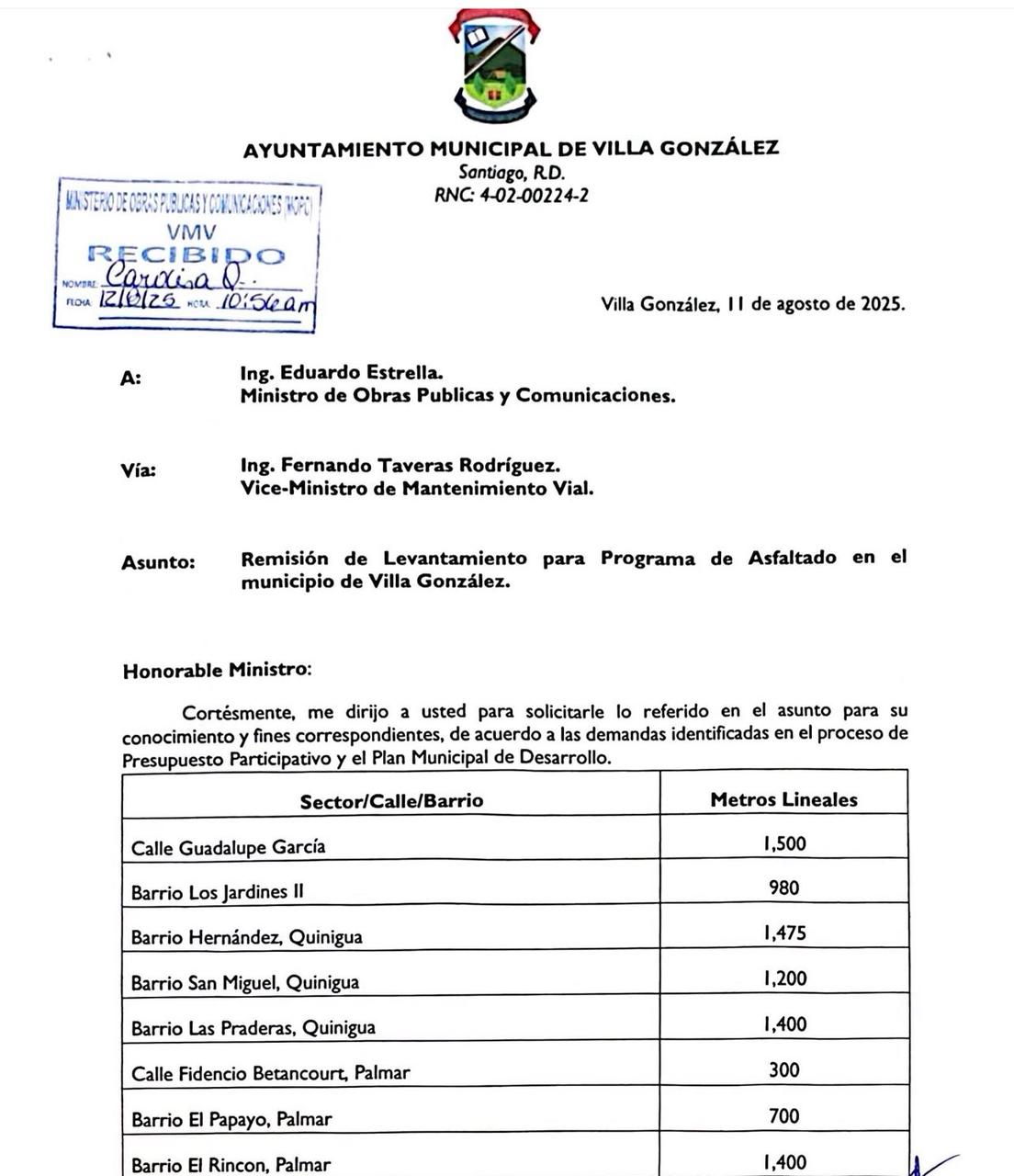Ayuntamiento de Villa González, nuestro alcalde municipal el Ing. César Álvarez solicitó al ministerio de Obras Públicas y Comunicaciones el programa de asfaltado para diferentes sectores del municipio de Villa González.