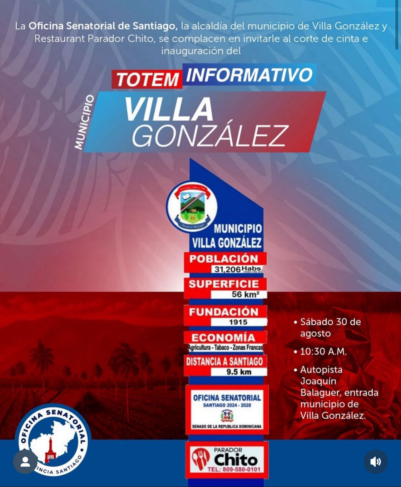 Este sábado 30 de agosto, a las 10:30 a.m., inauguraremos el Tótem Informativo de Villa González, una obra que resalta su historia, economía y valores.