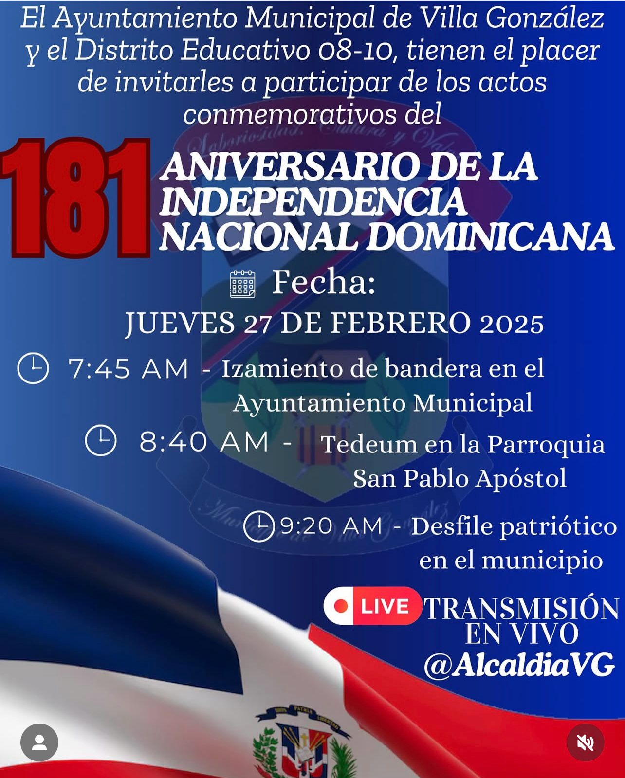 El Ayuntamiento Municipal de Villa González y el Distrito Educativo 08-10, tienen el placer de invitarles a participar de los actos conmemorativos del 181 Aniversario de la Independencia Nacional Dominicana.